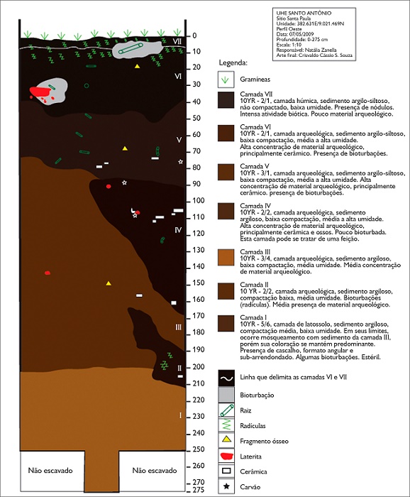 A camada I é constituída por sedimento argiloso marrom (7.5YR4/6), estéril arqueologicamente. Trata-se do comumente denominado ‘latossolo’, formado através de processos naturais.