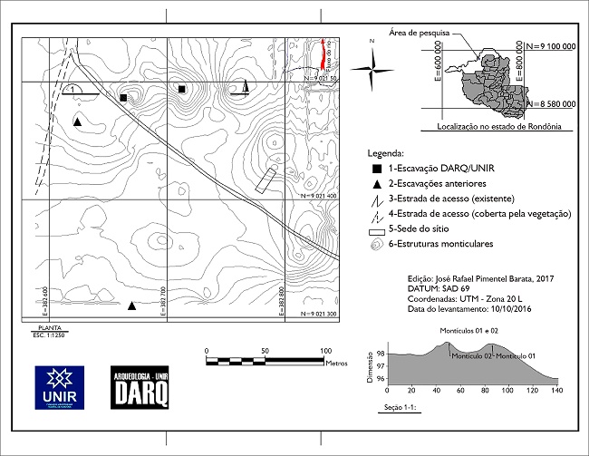 Foram iniciadas duas áreas de escavação do DARQ/NCH/UNIR no sítio Santa Paula, sendo uma no topo do montículo mais formal do sítio, alçado a aproximadamente 1,7 m em relação ao nível da praça, referido como ‘montículo 1’, e outra ao longo do perfil do montículo seccionado pela estrada de acesso na porção noroeste, a 1,5 m de altura em alusão à praça, doravante ‘montículo 2’ (Figura 4). As escavações foram idealizadas com o objetivo de obter dados para explicar e interpretar o processo de formação das estruturas monticulares e os seus significados históricos e culturais, através da descoberta e da interpretação das camadas estratigráficas, e da observação e análise da organização espacial do contexto arqueológico dentro dos montículos (Harris, 1991; Joukowsky, 1980; Schiffer, 1987; Zapatero, 2013).