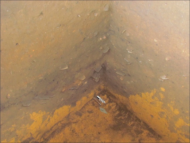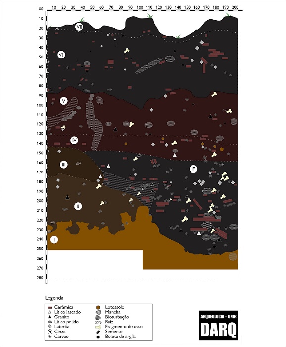 Nas unidades no topo do montículo 1 (N1000/E1000, N1001/E1000, N1000/E1001 e N1001/E1001), foram escavados 27 níveis artificiais, os quais resultaram no peneiramento de 13.422 litros de sedimento e na coleta de 42.812 materiais cerâmicos, líticos, faunísticos e botânicos, bem como na descoberta de ao menos sete camadas estratigráficas, numeradas de acordo com a interpretação cronoestratigráfica, e parte de uma estrutura, do tipo bolsão, enterrada abaixo da base do montículo (Figuras 6 e 7).