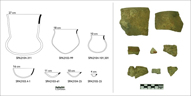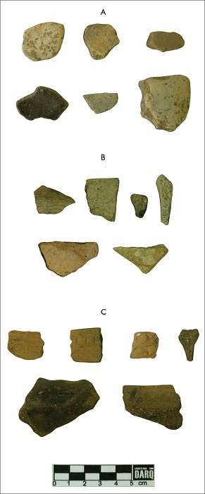 Diferente do setor sul do sítio, onde a ocupação Pocó-Açutuba é bem mais evidente, com uma frequência considerável de fragmentos, dispostos em uma camada de 70 cm de espessura (Santos Costa, 2019), no montículo 1 a frequência é baixa e os fragmentos estão misturados com os materiais Santa Paula (na camada II), Morro dos Macacos (na camada III, no bolsão e na camada IV) e Barrancoide (no bolsão e na camada IV). Até onde foi possível depreender por meio da análise da tecnologia cerâmica, as pastas utilizadas na confecção das vasilhas Pocó-Açutuba no montículo 1 tinham como antiplásticos quartzo, óxido de ferro, caraipé A e carvão. As vasilhas eram manufaturadas através do acordelamento. Quanto à forma, apresentavam bordas diretas verticais, inclinadas interna e externamente, e expandidas, com lábios planos e biselados, contornos carenados e espessuras entre 0,3 e 1,2 cm. As faces interna e externa eram acabadas com alisamentos finos e polimentos, e decoradas com engobos vermelhos e brancos, e incisões finas. Os núcleos majoritariamente escuros dos fragmentos sugerem que as vasilhas eram queimadas em ambiente redutor (Figura 9).