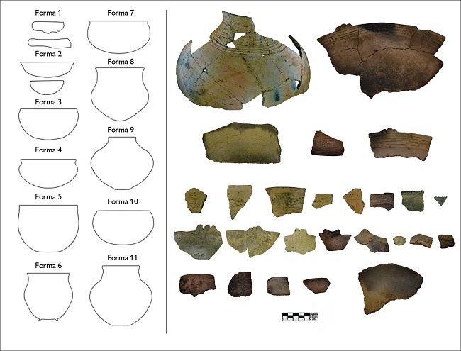 Os fragmentos da Tradição Polícroma da Amazônia foram observados nas camadas V e VI, entre os níveis 0-10 e 40-50 cm, em conjunto com cerâmicas Barrancoide. A pasta apresentava antiplásticos minerais, caraipé A, carvão e caraipé B. A manufatura era acordelada. O vasilhame apresentava bordas diretas verticais e inclinadas externamente, espessamentos lineares e expandidos, lábios planos, arredondados e biselados, bases convexo-côncavas, formas restringidas, restringidas com gargalo e não restringidas, contornos simples e infletidos, em forma de calota e elípticas, diâmetros da boca entre 4 e 27 cm, e espessura variando de 0,4 a 1 cm. As faces eram alisadas e polidas. Predominava a queima reduzida em relação à oxidante. As vasilhas eram decoradas com incisões sobre engobo branco, pinturas vermelhas, vermelhas sobre engobo branco, vermelhas e brancas, e engobos vermelhos. A análise da morfologia e das marcas de uso, com a identificação de marcas de fermentação, redução e fuligem, indica que as vasilhas eram utilizadas para servir, processar e armazenar alimentos sólidos e líquidos, através de fermentação e cozimento (Figura 11).