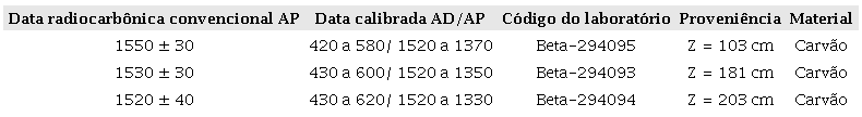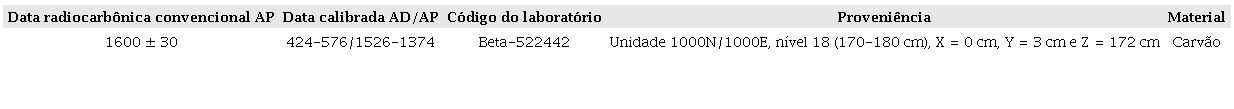 Uma amostra de carvão coletada na parte superior do bolsão foi datada em 1.600 ± 30 AP, pelo método radiocarbônico (Quadro 2). É importante notar que essa data se encontra dentro da margem de erro das outras datações obtidas anteriormente (Quadro 1). Por outro lado, a localização da unidade 382631/9021469 na planta planialtimétrica mostra que a mesma foi escavada sobre a borda sul do montículo 2 (Figura 4). Além disso, a estratigrafia da unidade, inclusive no que se refere aos contextos datados, formados por feições associadas à cerâmica Barrancoide, é semelhante à das unidades escavadas e datadas no montículo 1 (Figuras 3 e 7). Assim, esses dados indicam que as estruturas monticulares e, consequentemente, a praça central, foram construídas simultaneamente por meio de processos culturais semelhantes, levados à cabo pelos portadores da cerâmica Barrancoide.