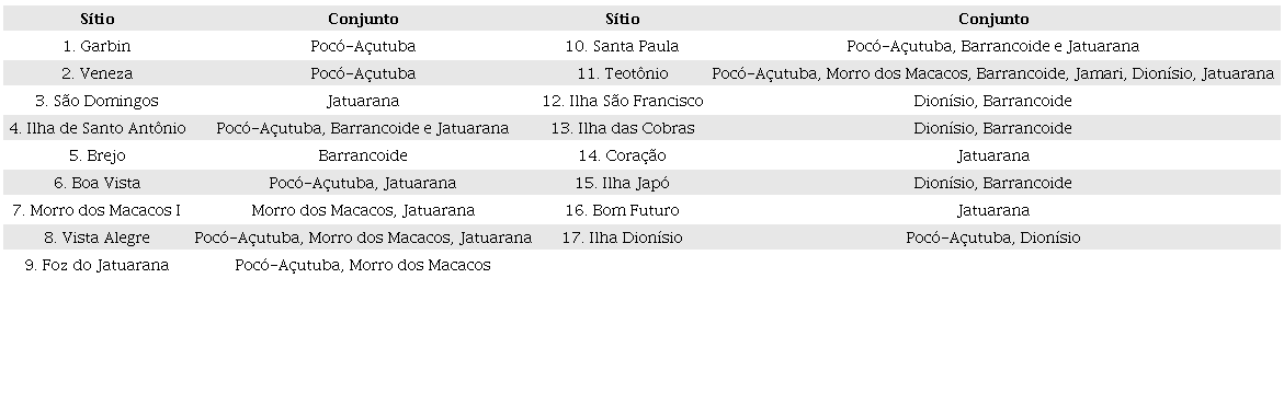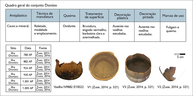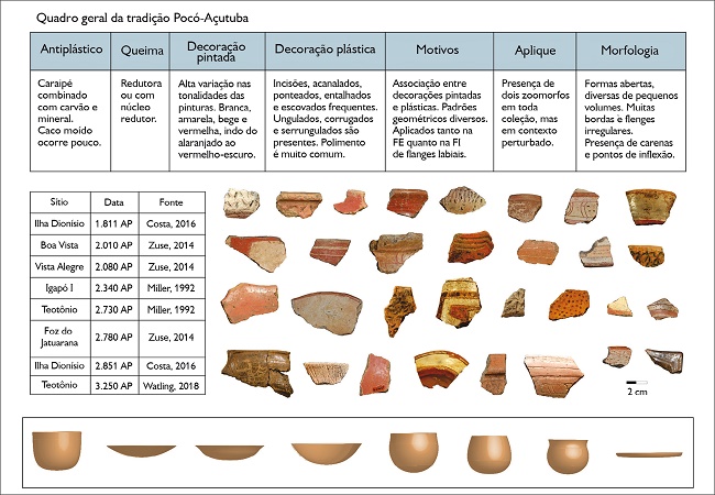 Essa teia descritiva, correlacionada aos aspectos deposicionais dos fragmentos, cria a possibilidade de se propor uma classificação em conjuntos tecnológicos, uma das etapas do estabelecimento de contextos culturais do passado (Raymond, 2009). Esse método foi aplicado a 8.320 fragmentos cerâmicos, provenientes das unidades de escavação realizadas. Foram identificados seis diferentes conjuntos tecnológicos cerâmicos, alguns com paralelos na bacia amazônica: a Tradição Pocó-Açutuba, a Tradição Barrancoide/Borda Incisa, a Tradição Regional Jamari e a subtradição Jatuarana da Tradição Polícroma da Amazônia. Dionísio e Morro dos Macacos são conjuntos locais e foram definidos por Costa (2016) e Zuse (2014) (Quadro 1).