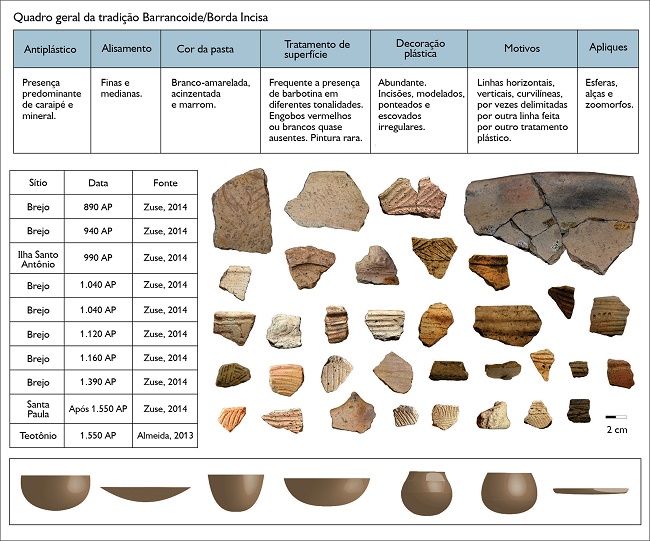 A Tradição Barrancoide/Borda Incisa no alto rio Madeira foi definida por Zuse (2014). Como em diversos outros pontos da bacia amazônica (Lima, 2008; Neves, 2012), parece haver certa continuidade com a Tradição Pocó-Açutuba, sobretudo em relação à cerâmica. Em contrapartida, há uma alteração nas escolhas das áreas de ocupação, com incursões e assentamentos em ilhas e em áreas afastadas das cachoeiras (Zuse, 2014). Os indícios arqueológicos mais seguros que revelam esse processo de transformação da Tradição Pocó-Açutuba para a Barrancoide/Borda Incisa são datados por volta de 1.550 anos AP, no entorno da cachoeira do Teotônio, tanto no sítio homônimo quanto no Santa Paula, na margem oposta do rio Madeira (Almeida, 2013; Kater, 2018; Zuse, 2014).