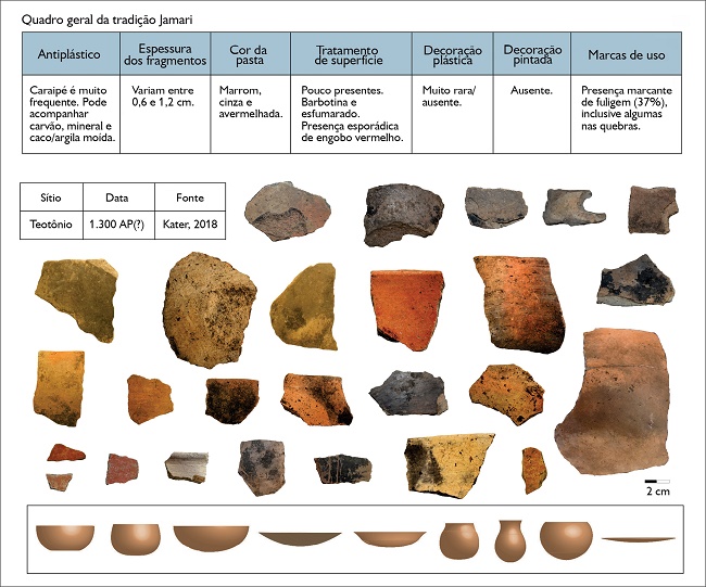 Há predomínio de formas sem ângulos. Quando eles ocorrem, são sutis. Também foram identificados vasos rasos com forma esférica, semiesférica e em calota; globulares, com bocas e pescoços levemente constritos. Pratos rasos e assadores também foram observados. Os nove tipos morfológicos comportavam tamanhos distintos, de capacidade volumétrica com até oitenta litros. As abundantes marcas de uso nos fragmentos (i.e. fuligem) permitiram uma boa aferição da função dos vasos, mostrando que existe uma relação entre o tamanho do vasilhame e a sua morfologia para escolha de uso (cf.Kater, 2018, pp. 245-250). As cerâmicas da Tradição Jamari possuem, ainda, a menor taxa de fragmentação no sítio, talvez por sua espessura ou pelo tamanho das vasilhas originais (Orton, 1989). O sítio Teotônio é o único em que se identificou material associado à Tradição Jamari no alto rio Madeira (Kater, 2018) (Figura 5).