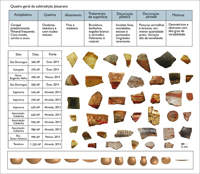 Por fim, a subtradição Jatuarana, da Tradição Polícroma da Amazônia (TPA), foi originalmente definida por Miller (1992) e reestudada por Almeida (2013), Pessoa (2015) e Vassoler (2016). Para o sítio Teotônio, o material da subtradição Jatuarana perfaz a maior amostra analisada. Boa parte do material está bem conservada, o que auxilia visualizar que as superfícies estão, em geral, bem alisadas. Os tratamentos de superfície são bastante comuns, enquanto marcas de uso não são frequentes.