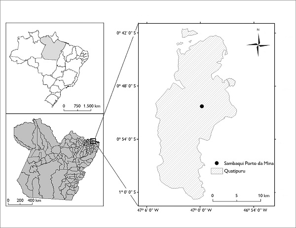 O município de Quatipuru está localizado no nordeste paraense (00º 53’ 49” S-47º 00’ 19” W) (Figura 1), possui relevo do tipo tabuleiros aplainados, com terraços e várzeas de maré, sedimentos argilo-orgânicos, com ocorrência dos solos hidromórficos argiloso e humoso (Souza-Filho & El-Robrini, 1996; Souza-Filho et al., 2009). Os ecossistemas encontrados nessa área são variados, formados por uma extensa rede hidrográfica, com presença de manguezais, campos salinos, restinga, praias, várzea de maré e terra firme, sendo escolhida para a construção dos sambaquis (Senna et al., 2011; Lopes et al., 2018).