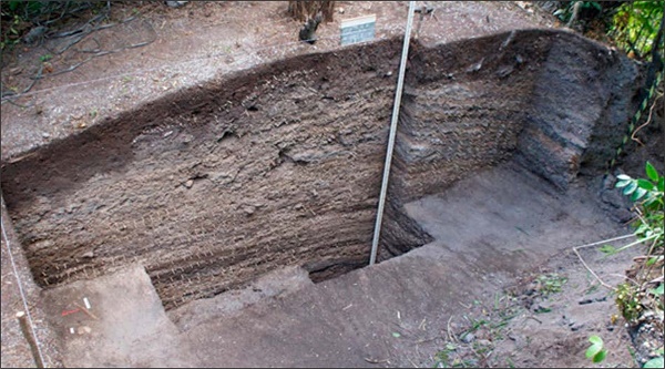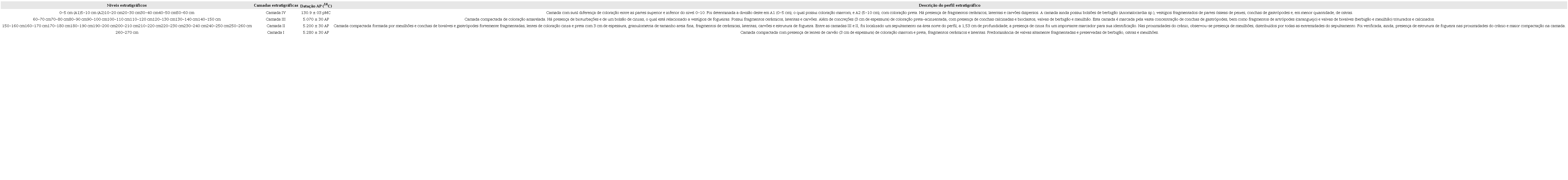 A estratigrafia proposta para o sítio sugere quatro camadas de ocupação, cujas datações mais recentes (Lopes, 2016) demonstram uma sequência cronológica para a ocupação do sítio da base para o topo, sendo que, na camada I, a datação é de 5.280 ± 30 anos AP; na camada II, de 5.200 ± 30 anos AP; na camada III, de 5.070 ± 30 anos AP; e, na camada IV, de 130.9 ± 03 pMC (Porcentagem de Carbono Moderno).