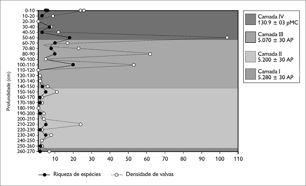 Os maiores valores de densidade de diatomácea foram encontrados no intervalo 50-60 cm (camada IV) e a maior riqueza foi registrada no nível estratigráfico 100-110 cm (camada III) (Figura 5). A baixa densidade encontrada pode estar relacionada à quantidade de material utilizado (0,5 g) para a preparação das lâminas permanentes. Dessa forma, em estudos arqueológicos, sugerimos que seja selecionada uma quantidade maior de material.