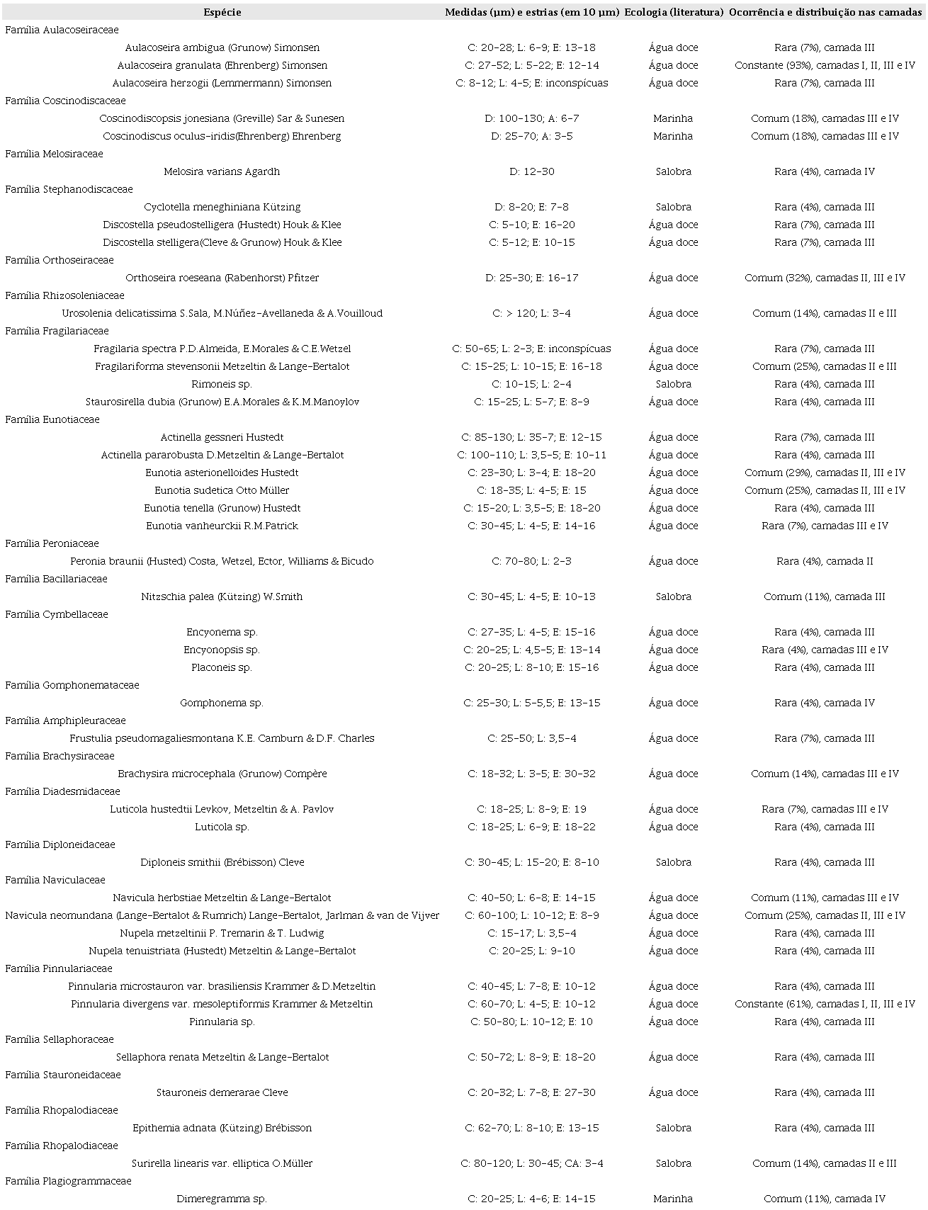 Para a identificação das espécies encontradas, foram obtidas medidas de comprimento, largura e densidade de estrias em 10 µm. A literatura utilizada para a identificação são referências para a América do Sul (Metzeltin & Lange-Bertalot, 1998, 2007; Metzeltin al., 2005), a fim de evitar a adaptação taxonômica forçada (Tyler, 1996). Para espécies indefinidas ou não reportadas nesses trabalhos, foram consultadas as publicações de Krammer e Lange-Bertalot (1986, 1988, 1991). As informações ecológicas foram obtidas através da revisão da literatura (Lowe, 1974; Denys, 1991; Van Dam et al., 1994; Lobo et al., 1995, 1996; Moro & Furstenberger, 1997).