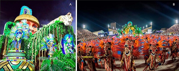 A ala “A cerâmica testemunha de um Brasil milenar”, composta pelos blocos de cerâmicas marajoaras e tapajônicas, seguia o carro abre-alas denominado “Mais invasão do que descobrimento”. Sobre o carro, que tinha como figura principal uma enorme cabeça de índio, rodeada por onças, sapos e florestas, os destaques sambavam sobre grandes potes de cerâmica decorada (Figuras 1 e 2). Tendo me dedicado por muitos anos ao estudo das cerâmicas arqueológicas da Amazônia e, em particular, às estatuetas, não pude deixar de me surpreender ao ver meus objetos de estudo sambando na avenida, enfim expostos ao enorme público do carnaval carioca, público este que jamais nós, arqueólogos, conseguiríamos atingir em nossas ações de divulgação ou educação patrimonial1.