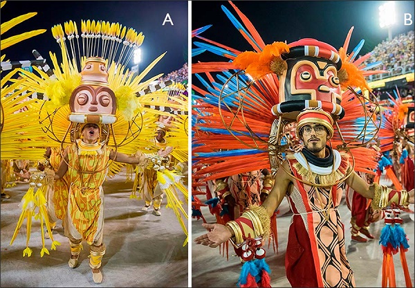 Dito isso, voltemos às alas de cerâmicas arqueológicas da Mangueira. É interessante notar quais elementos morfológicos e visuais foram retidos para a criação das fantasias de cerâmicas marajoara. Primeiramente, vemos que apenas a cabeça de artefatos antropomorfos marajoara foi selecionada; o corpo foi composto pelo próprio passista, que usou uma roupa com motivos geométricos genéricos, emulando uma possível pintura corporal. Estes motivos não são marajoaras e se repetem na fantasia “cerâmica tapajônica”. Aqui, a inspiração é claramente de algum motivo gráfico indígena ‘genérico’, no caso xinguano, o que nos mostra o foco maior dado à cabeça na concepção da fantasia representando a cerâmica marajoara.