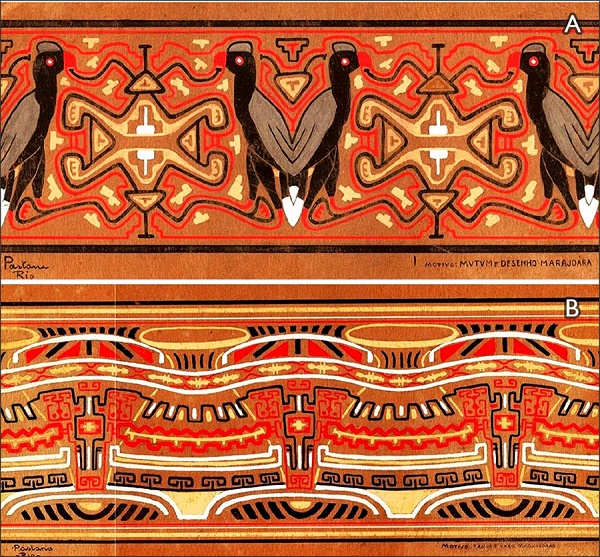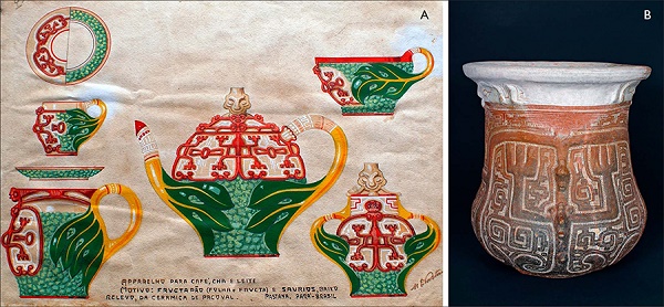 É interessante notar que alguns princípios típicos da arte marajoara, como os que Schaan (1997) identificou como redução, ou estilização de motivos figurativos, têm total correspondência na arte decorativa europeia. A diferença está no fato de que, na arte marajoara, assim como na de outros grupos ameríndios amazônicos, os elementos figurados muito raramente são plantas, sendo o mais comum a representação de animais (cobras, onças, lagartos etc.) ou seres multicompostos, com partes de corpos de animais (Nobre, 2017). Aos olhos dos artistas e designers da época, tal iconografia era bastante consistente com a busca de imagens que representassem uma nova identidade nacional, aludindo a nossas florestas e fauna, facilmente adaptável aos princípios de composições da arte decorativa europeia.