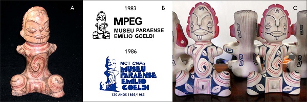 Em trabalho anterior, já apontamos para o potencial que os objetos arqueológicos antropomorfos exibem para a interface com o público atual e a transmissão de conhecimento arqueológico em contextos contemporâneos devido ao alto grau de reconhecibilidade que estes objetos antropomorfos exibem. Constatamos, por exemplo, que, via de regra, estes são os escolhidos para representarem o passado arqueológico da Amazônia, nas vitrines de museus, capas de livros e catálogos, sendo até mesmo usados como logotipos de museus (Barreto, 2013). Uma peça em particular, às vezes chamada de ‘miss marajoara’, tem uma longa biografia de publicações e exposições, sem contar as réplicas artesanais ainda produzidas em grandes quantidades (Figura 8).