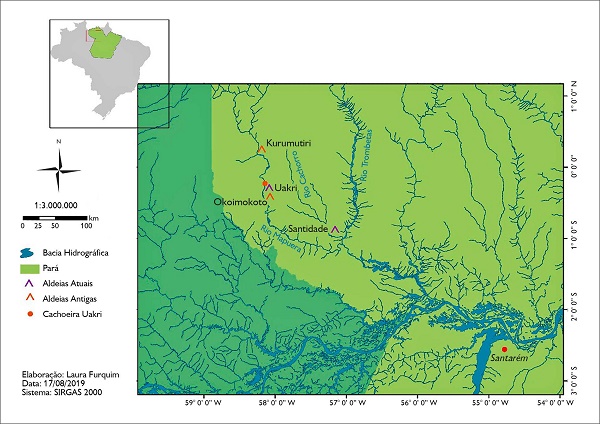 A bacia do rio Trombetas (Figura 2) localiza-se na parte sul do planalto das Guianas. O rio Trombetas é um rio de águas claras que, após a confluência com o rio Nhamundá, desemboca no baixo Amazonas, próximo a Oriximiná. É formado por rios que nascem na fronteira da Guiana com o Suriname. No Brasil, a bacia do Trombetas se encontra no estado do Pará, nos municípios de Oriximiná, Terra Santa, Óbidos e Faro (Jácome, 2017). Entre os afluentes mais importantes do Trombetas, está Mapuera, Cachorro ou Katxuru, Yaskurí, rio do Velho ou Kuhá e, na parte mais equatorial, o Turuni. Do lado esquerdo, o Trombetas recebe os rios Erepecuru, Damiana ou Kahyáhó, Katxpakuru, Imnohúmu e Ponékuru (Frikel, 1958, p. 115).