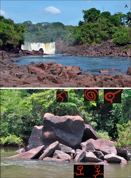 Encontramos antigas aldeias Katxuyana na região de cabeceiras e interflúvio dos rios Cachorro e Cachorrinho (Frikel, 1970; Girardi, 2011) e tecemos algumas observações, a partir de mais dois outros locais mencionados na história ora relatada: a aldeia de Yuhuru-manáo, genro de Marmaru-imó, no Varadouro Grande, na cachoeira de São Pedro (SanMan Kahxi) e o local do assentamento dos filhos de Pura, na aldeia de Santidade (Jácome, 2017) (Figura 3). A aldeia do Yuhuru-manáo fica próxima à cachoeira de São Pedro, que conta com uma grande queda e paredões com gravuras rupestres (Jácome, 2017). As figuras aludem a seres antropomorfos, contudo, há também uma figura circular espiralada, semelhante a formas atualmente lidas como ‘cobras’ pelos indígenas (Jácome, 2017). Poderiam os antropomorfos serem os filhos de Pura? Seria a figura espiralada a anaconda criando o rebujo? A aldeia de Santidade também é um sítio arqueológico, apresentando ao menos duas áreas de terra preta e vários fragmentos de cerâmica e de materiais líticos polidos e lascados. Identificamos vestígios de cerâmica tanto do estilo Espinha de Peixe quanto do Konduri (Jácome, 2017).
