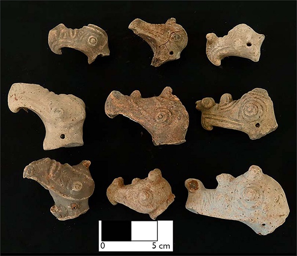 No rio Cachorro, essa relação da cerâmica com o xamanismo também parece ser forte e recorrente. Na aldeia de Santidade, encontramos dois fragmentos de aplique Konduri em forma de cabeça de urubu, ambos com furo na base (já original da cerâmica, mas aumentado), no qual foi transpassado um cordão (Jácome, 2017) (Figura 6). Se nos voltarmos novamente para o rio Mapuera, temos como base a descrição de um mito/história Wai Wai (Fock, 1963; Howard, 2001), sobre a gente Urubu, com habilidades de transformação corporal xamânica, assim como também a informação de que os urubus eram espíritos auxiliares de Ewká, enquanto este ainda era pajé. O mito/história, aliado ao relato de Poricwi, sobre a música cantada aos urubus, como ora apontado, demonstra que o urubu está fortemente relacionado ao xamanismo. Todos esses elementos nos dão suporte para inferir a relação dos dois pequenos fragmentos Konduri ao xamanismo atual e histórico (Jácome, 2017).