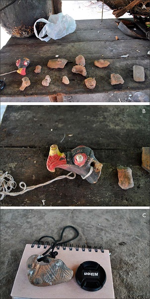 Jácome (2017) também fez alguns apontamentos para relacionar a cerâmica arqueológica ao xamanismo. Por bastante tempo essa relação parecia de oposição, já que a maior parte das pessoas das aldeias do Mapuera, Cachorro e Trombetas demonstrava pouco interesse nos objetos arqueológicos (fragmentos, vasilhas, lascas e lâminas de machado) que surgiam das valetas de casas ou em fossas sanitárias. Certa vez, o Cacique Amayta, após ver uma foto da coleção de apliques zoomorfos Konduri, disse que aqueles objetos poderiam trazer de volta os antigos xamãs (Figura 4). Essa fala nos fez pensar que talvez a relação da cerâmica arqueológica com o xamanismo não estivesse restrita apenas ao passado anterior ao período da conversão (Jácome, 2017).