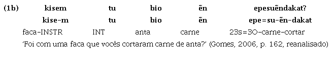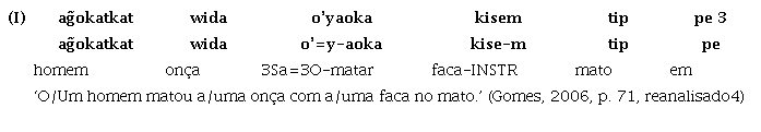 Esse exemplo traz uma construção transitiva prototípica. O verbo aoka ‘matar’ tem dois argumentos: ag̃okatkat ‘homem’ e wida ‘onça’. Nessa ordem, compreende-se que o homem matou a onça. Argumentos desse tipo não requerem marcação de caso. Eles são indicados por morfemas pessoais no verbo, respectivamente: {o’=}, pronome de 3ª pessoa do singular em função de sujeito com verbos transitivos e intransitivos processuais/ativos, e {i-}, prefixo de 3ª pessoa do singular em função de objeto direto neste caso5. Os elementos circunstantes, por sua vez, não são marcados no verbo e, geralmente, ocorrem em final de sentença. No exemplo (I), há um instrumental (kise-m ‘faca-com’) e um sintagma posposicional locativo (tip pe ‘mato em’). O debate sobre o status argumental e não argumental dos participantes não será desenvolvido aqui, a fim de não fugir ao tema do texto6.