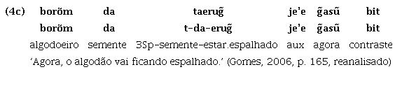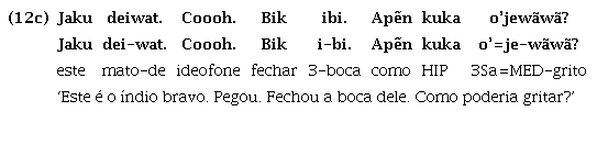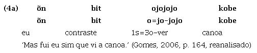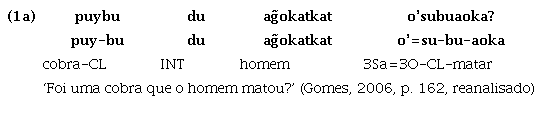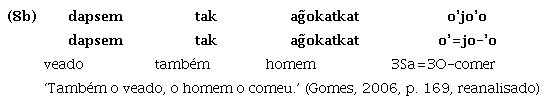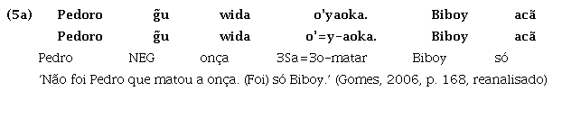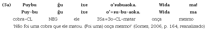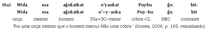 O exemplo (6a), a seguir, traz o objeto direto (wida ma ‘onça mesmo’) deslocado para a esquerda, ocorrendo antes do sujeito da sentença (OSV, em lugar de SOV). Isso faz parte do processo de focalização contrastiva, como temos aqui abordado. Esse objeto direto vem acompanhado da partícula ma, que exerce o papel pragmático de valor de verdade (modalidade epistêmica). Logo na sequência, o falante deixa claro que não foi uma cobra que havia sido morta. Para tanto, usa a partícula de negação contrastiva g̃u junto ao constituinte negado (puybu g̃u), seguida da partícula de contraste bit, que faz um contraste maior ainda, entre sentenças/pontos de vista, a fim de contrariar o que falou o seu interlocutor anteriormente: