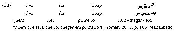 Nesse sentido, os enunciados (1c) e (1d) “[...] podem ser ditos durante uma corrida, mas é em (1d) que o falante manifesta insistência” (Gomes, 2006, p. 163). Em (1c), ocorre apenas a palavra interrogativa abu ‘quem’, forma frequente, regular e não marcada de interrogar o argumento sujeito com traço mais animado. Já em (1d), o falante acrescenta a partícula interrogativa du para imprimir um valor de realce ao que está sendo interrogado: abu du.