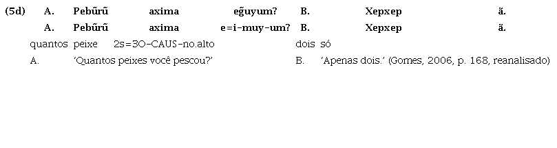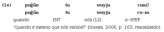 O exemplo (1e), a seguir, foi dito “[...] por uma criança eufórica que queria saber quando ela e o pai iriam sair” (Gomes, 2006, p. 163). Em exemplos corriqueiros, ocorre apenas a palavra interrogativa pug̃ũn ‘quando’. Mas, nesse caso, a combinação da partícula interrogativa com a palavra interrogativa acarreta uma leitura de realce para a interrogação: