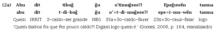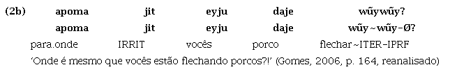 Aqui também estamos diante de uma partícula usada em contexto interrogativo, combinando-se, pragmaticamente, com palavras interrogativas – abu e apoma, (2a) e (2b), respectivamente –, as quais não requerem partícula em contextos comuns de interação. Mas o uso da partícula evidencia que o efeito desejado é expressar a irritação do falante enquanto faz uma pergunta aberta. Especialmente no contexto do exemplo (2b), há uma discordância do falante frente ao que o seu interlocutor lhe havia respondido antes. Por isso, se dá o uso da partícula interrogativa em questão junto à palavra interrogativa, para deixar claro que um falante não está acreditando no que o outro estava lhe respondendo. Ocorre aí o fronteamento do elemento focalizado, o uso da partícula e um contorno entonacional, que agrega a palavra interrogativa e a partícula interrogativa no mesmo constituinte.