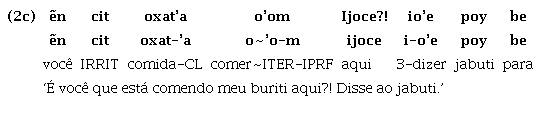 Em nossos dados, o uso de jit vem regularmente acompanhando palavras interrogativas, como ilustramos. Mas encontramos também o uso dessa partícula incidindo sobre uma palavra não interrogativa. Nesses casos, a partícula também questiona um constituinte, provoca focalização e explicita a irritação do falante. No exemplo (2c), extraído de uma narrativa, a anta está irritada com o jabuti, o qual está comendo a comida dela. Daí, faz a ele a seguinte pergunta: