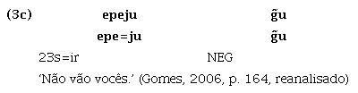 A negação de constituintes em Mundurukú se dá mediante o acréscimo da partícula g̃u após o elemento negado (Gomes, 2006). Em (3a), há um exemplo de negação de participante de tipo argumento: puybu ‘cobra’. Em (3b), há um exemplo de negação de adjunto expresso por sintagma posposicional: kobe dag̃ ‘por canoa’. E, em (3c), é o constituinte verbal que está sendo negado: epeju ‘ (vocês) vão’.