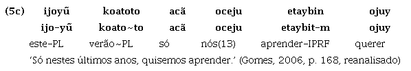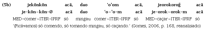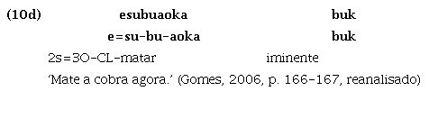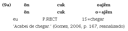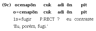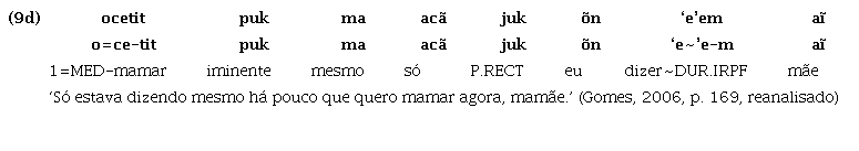 A seguir, o exemplo (9d) traz a partícula juk incidindo sobre a oração õn ’e’em ‘eu estava dizendo’, para expressar a ideia de que se trata de um passado recente. Imediatamente antes dela, ocorre também a partícula acã ‘só’, que restringe a ação. E, antes delas, ocorrem mais duas outras partículas – puk ‘iminente/desejo’ e ma ‘ênfase/certeza’ –, que incidem sobre o constituinte verbal ocetit ‘eu mamo’, para expressar a ideia de: ‘eu quero mamar agora mesmo’: