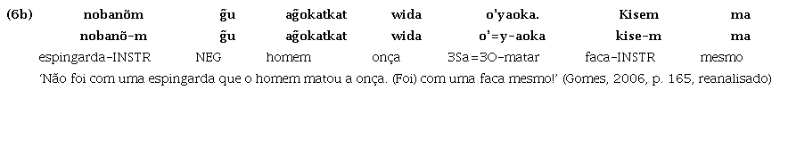 Os exemplos seguintes trazem situação bastante semelhante, com a negação do instrumento em (6b) e do núcleo do predicado verbal em (6c), focalizando e contrastando esses constituintes com outros, que virão acompanhados de ma. Em (6b), o constituinte modificado pela partícula modalizadora ma (kisem ma ‘uma faca mesmo’) ocorre sozinho na proposição, sendo o restante dela recuperável automaticamente: