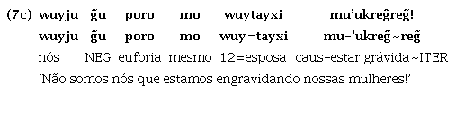 No exemplo (7c), poro modifica um constituinte que também é modificado pela partícula de negação g̃u. Essa frase foi dita em um contexto em que um interlocutor informa ao outro que, ao contrário do que eles dois pensavam, não eram eles que estavam engravidando as próprias esposas. Por isso, o uso da focalização de contraste por meio da partícula de negação ocorre somado à partícula que denota admiração/surpresa – poro: