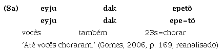 A relação entre partículas e os constituintes modificados por elas também nos permitiu refletir sobre a função pragmática de pronomes livres optativos, como abordado na seção em que descrevemos o uso da partícula de foco de inclusão. Como dissemos, essa relação pragmática entre partículas e pronomes pessoais livres merecerá mais de nossa atenção em pesquisas futuras. Assim como merecerá atenção o estudo diacrônico das partículas dentro da família e do tronco linguístico.