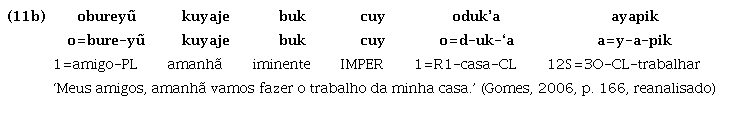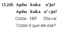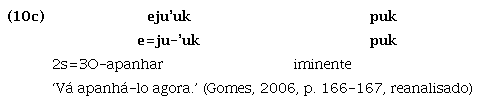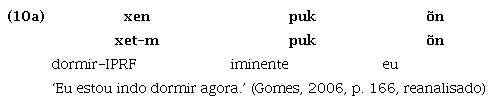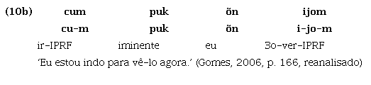 Em (10b), os verbos cu ‘ir’ e jo ‘ver’ também estão flexionados com o sufixo de aspecto imperfectivo. A partícula puk incide sobre o primeiro verbo, ocorrendo imediatamente após ele, informando sobre uma ação que irá acontecer com certeza muito em breve:
