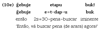 Em outros contextos, o uso da partícula buk/puk implica o falante estar dando uma ordem (10c-10d), que deverá ser cumprida imediatamente:
