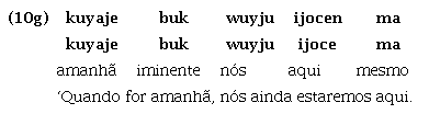 No exemplo (10g), a partícula buk incide sobre o advérbio kuyaje ‘amanhã’, mostrando o valor de iminente, instaurado pela partícula. Entendemos que aí se encontra um predicado não verbal. O grau de certeza, o qual é também produzido indiretamente por buk sobre o que é dito, é reforçado pelo uso da partícula ma, no final da sentença.