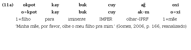 Associada ao imperativo, a partícula juy17 , de acordo com explicações dadas pelos próprios falantes, “[...] implica ordem ou sugestão, mas de caráter extremamente polido, educado, dando margem, inclusive, a uma recusa” (Gomes, 2006, p. 166). O exemplo (11a) traz um pedido feito a uma mãe, em que o verbo ag̃ ‘olhar, cuidar’ foi modificado pela partícula cuy, a fim de expressar um tipo de ordem do falante ao ouvinte. Porém, o uso de cuy implica, em realidade, um pedido e não um comando irrecusável propriamente dito. Nesse mesmo exemplo, aparece também a partícula buk, que indica a ideia de desejo de que ação ocorra daí a pouco tempo: