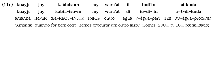 Este último exemplo traz duas ocorrências da partícula juy/cuy. No primeiro uso, entendemos que seu escopo seria sobre o predicado não verbal kabiaisum ‘(quando for) bem cedo’. O segundo uso incidiria sobre o objeto direto e seu verbo: wara’at ti iodi’in atikuda ‘procuraremos outro lago’.