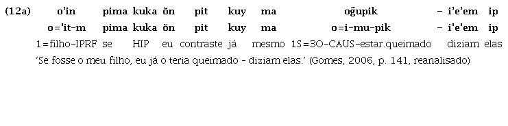 A partícula de hipótese kuka ocorre após o predicado não verbal condicional – o’in pima kuka ‘se fosse meu filho’. Além dela, nesse exemplo (12a) ocorrem outras partículas já abordadas neste texto. A partícula pit ‘contraste’ informa uma expectativa contrária ao que acontecia, algo como: ‘em lugar de criar como essa mãe está fazendo, eu queimaria essa criança’. Após a partícula pit, ocorre o advérbio kuy ‘já’, seguido da partícula ma ‘ênfase/certeza’. Essa última partícula demonstra o grau de convicção que era expresso por quem falava aquele tipo de coisa.