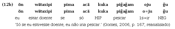 O exemplo (12b), a seguir, também traz a partícula kuka associada a um predicado condicional introduzido pelo elemento subordinante pima ‘se’. Também vemos aí o uso de outra partícula já abordada – acã ‘restritivo’: