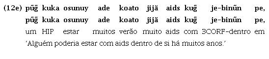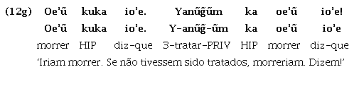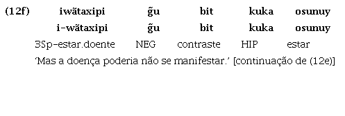Essa correlação entre hipótese (kuka) e condição (pima) é bastante recorrente e, à primeira vista, pareceria indissociável, se não houvesse na língua exemplos em que ocorre apenas a condição sem a hipótese, como no exemplo (4b), apresentado na seção “Partículas de negação, contraste e restrição”. Já a ocorrência de hipótese sem condição também é recorrente e aparece em exemplos como (12c):