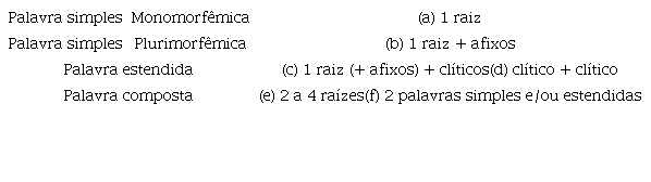 As definições dos tipos de palavras morfológicas estabelecidas pelo Quadro 1 requerem uma definição independente dos tipos de morfemas que compõem as palavras. Isso será feito, sobretudo, nas seções “Raízes versus demais tipos de morfemas” e “Afixos e clíticos”. Por outro lado, podemos definir o que é a palavra a partir de evidências independentes da sintaxe (conforme discutido em seguida) e indiretas da ortografia e da fonologia (ver as seções “Palavra ortográfica” e “Palavra fonológica”).
