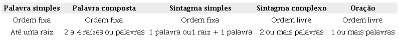 Em (2), os sintagmas mínimos são formados por uma única palavra morfológica. No domínio da palavra, não pode haver alteração na ordem dos morfemas, nem a ligação entre os morfemas pode ser interrompida por uma outra palavra. No domínio da oração, qualquer alteração na ordem dos constituintes é permitida, e a ligação entre dois sintagmas também pode ser interrompida por uma palavra ou sintagma independente5.