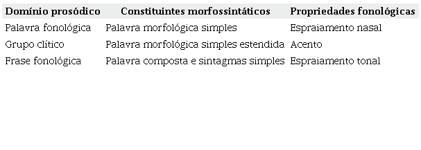 Seguindo a proposta da fonologia prosódica (Nespor; Vogel, 1986), podemos indicar os seguintes domínios prosódicos em Kubeo e sua correlação com os tipos de constituintes morfossintáticos, conforme o Quadro 4: