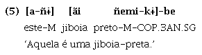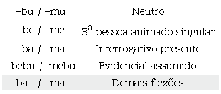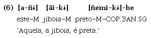 Um morfema do sintagma à parte é a cópula em Kubeo, cujo paradigma está ilustrado no Quadro 6. O paradigma divide-se entre dois tipos de morfemas: os três primeiros são invariáveis e usados, sobretudo, no tempo presente, enquanto o último é uma raiz que pode se combinar com qualquer tipo de flexão verbal e, por isso, é usada quando informações morfossintáticas para além de pessoa, número e gênero são necessárias. Todas as formas são nasalizáveis e se comportam como afixos no nível fonológico. Além disso, a cópula claramente possui uma função gramatical bem definida14.