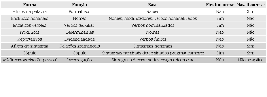 Resumimos no Quadro 7 os principais pontos discutidos nesta seção sobre afixos e clíticos. Os tipos de morfemas estão agrupados em cinco grandes grupos, representados por tons de cinza e branco no Quadro 7, sendo eles: afixos da palavra, clíticos da palavra, afixos do sintagma, cópula e enclíticos do sintagma.