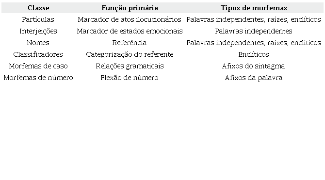 Como vemos, na definição sobre o que são partículas, convergem diferentes conceitos e propriedades que pretendo tornar mais explícitos e independentes neste artigo. Primeiramente, faço a distinção entre propriedades gramaticais, fonológicas e ortográficas do que são palavras (cf. Dixon, 2009). Com relação às propriedades gramaticais de uma palavra, elaboramos as seguintes distinções (expandindo a proposta de Hengeveld; Mackenzie, 2008): (i) tipo de morfemas – ou seja, suas propriedades formais como afixos, raízes e clíticos; (ii) classe de morfemas – ou seja, as propriedades funcionais de um dado morfema na construção semântica e gramatical de uma palavra ou sintagma (incluindo seu papel como morfema lexical ou funcional na formação de classes de palavras como nomes, verbos, adjetivos).