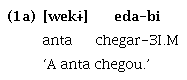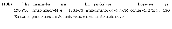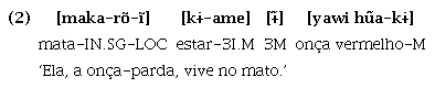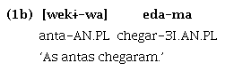 A distribuição sintática de i-kɨ e i-ko mostra que essas partículas são os últimos morfemas dos sintagmas com os quais se combinam, podendo estar acentuados, devido à sua estrutura dissilábica, ou mesmo átonos, em razão de geralmente estarem ao final de um constituinte prosódico. A vogal inicial é nasalizável somente em fala rápida, mostrando que este é um processo fonético, e não fonológico (cf. Chacon, 2012, capítulo 3). Sintaticamente, podem se combinar a outros constituintes não verbais, como em (21a) e (21b), mostrando ter uma distribuição sintática bastante livre.