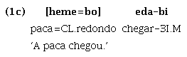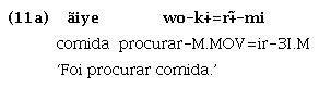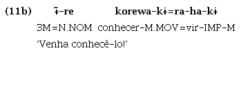 Existem dois tipos de enclíticos verbais. Primeiro, temos os morfemas que indicam ‘direção centrípeta’ e ‘direção centrífuga’, que são formas reduzidas dos verbos da ‘vir’ e nɨ ‘ir’. Os exemplos (11a) e (11b) ilustram os dois tipos de construções12.