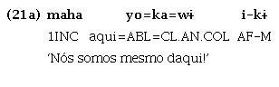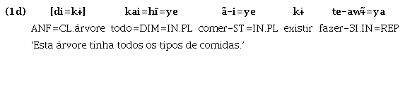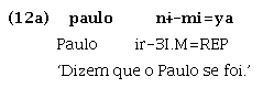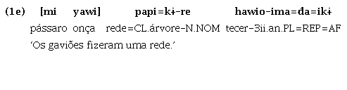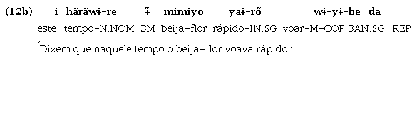 Um outro tipo de enclítico verbal é o morfema =ya, que indica ‘evidencialidade reportativa’. Este morfema aparece de maneira regular sempre à direita de um verbo finito ou cópula, seguindo toda classe de morfemas derivacionais e flexionais, e não se nasaliza, conforme os exemplos em (12).